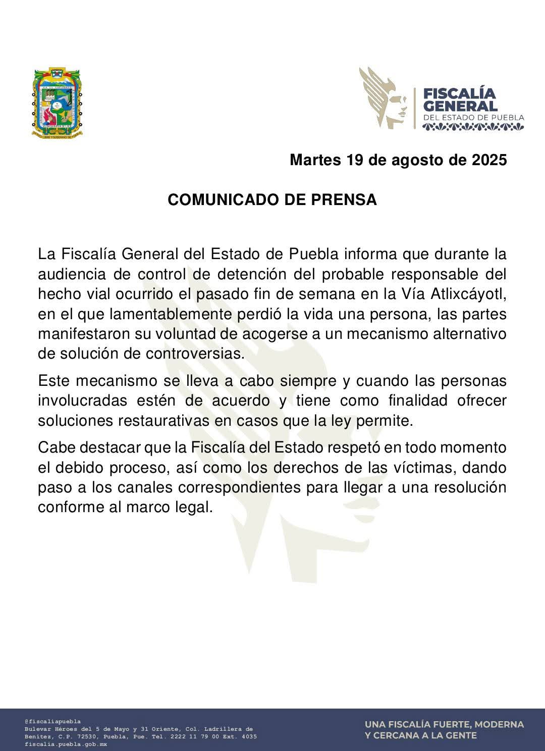 La Fiscalía General del Estado de Puebla (FGE) confirmó la liberación de Luis Ángel N., señalado como responsable del accidente en la Vía Atlixcáyotl que derivó en una carambola de siete vehículos y dejó como saldo la muerte de un hombre de 53 años de edad.