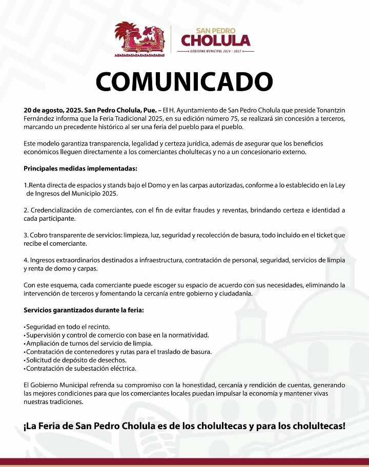 El H. Ayuntamiento de San Pedro Cholula que preside Tonantzin Fernández informa que la Feria Tradicional 2025, en su edición número 75, se realizará sin concesión a terceros, marcando un precedente histórico al ser una feria del pueblo para el pueblo.