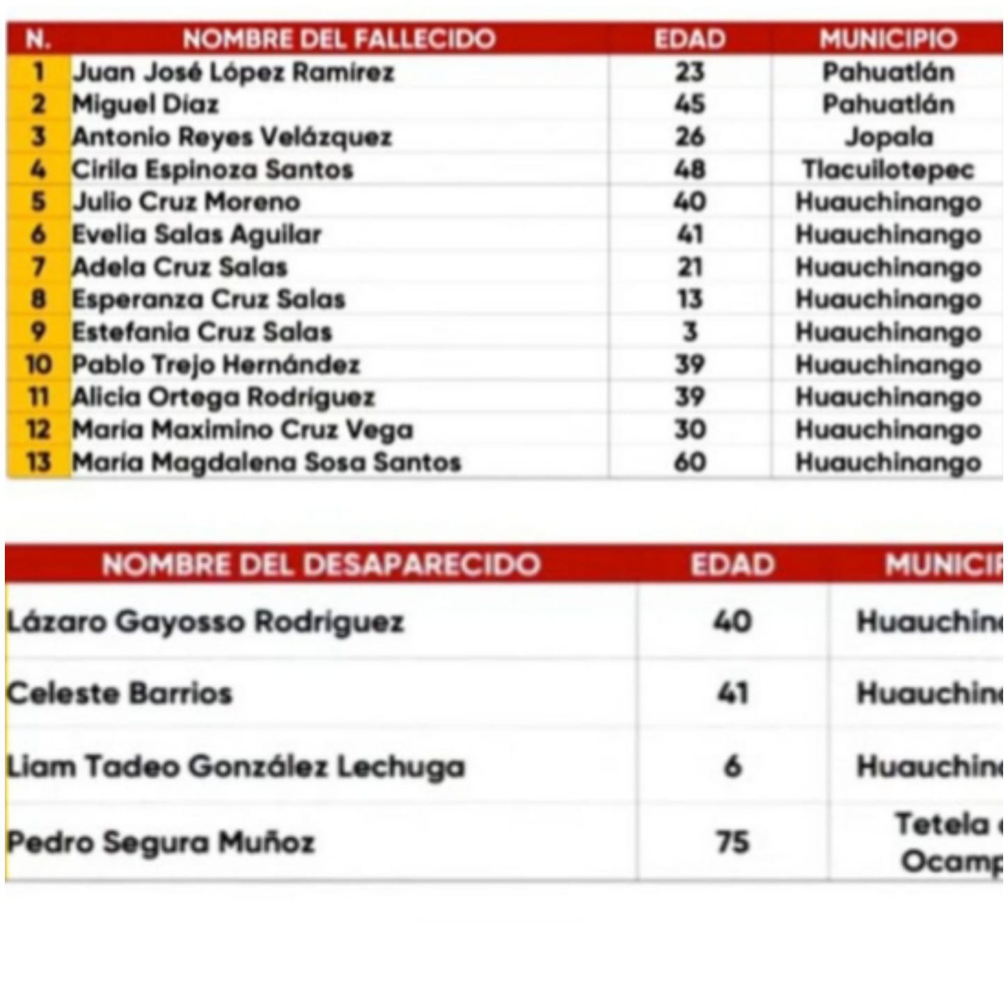 En otros municipios, las lluvias dejaron víctimas como Juan José López Ramírez (23 años) y Miguel Díaz (45) en Pahuatlán; Antonio Reyes Velázquez (26) en Jopala; y Cirila Espinoza Santos (48) en Tlacuilotepec.