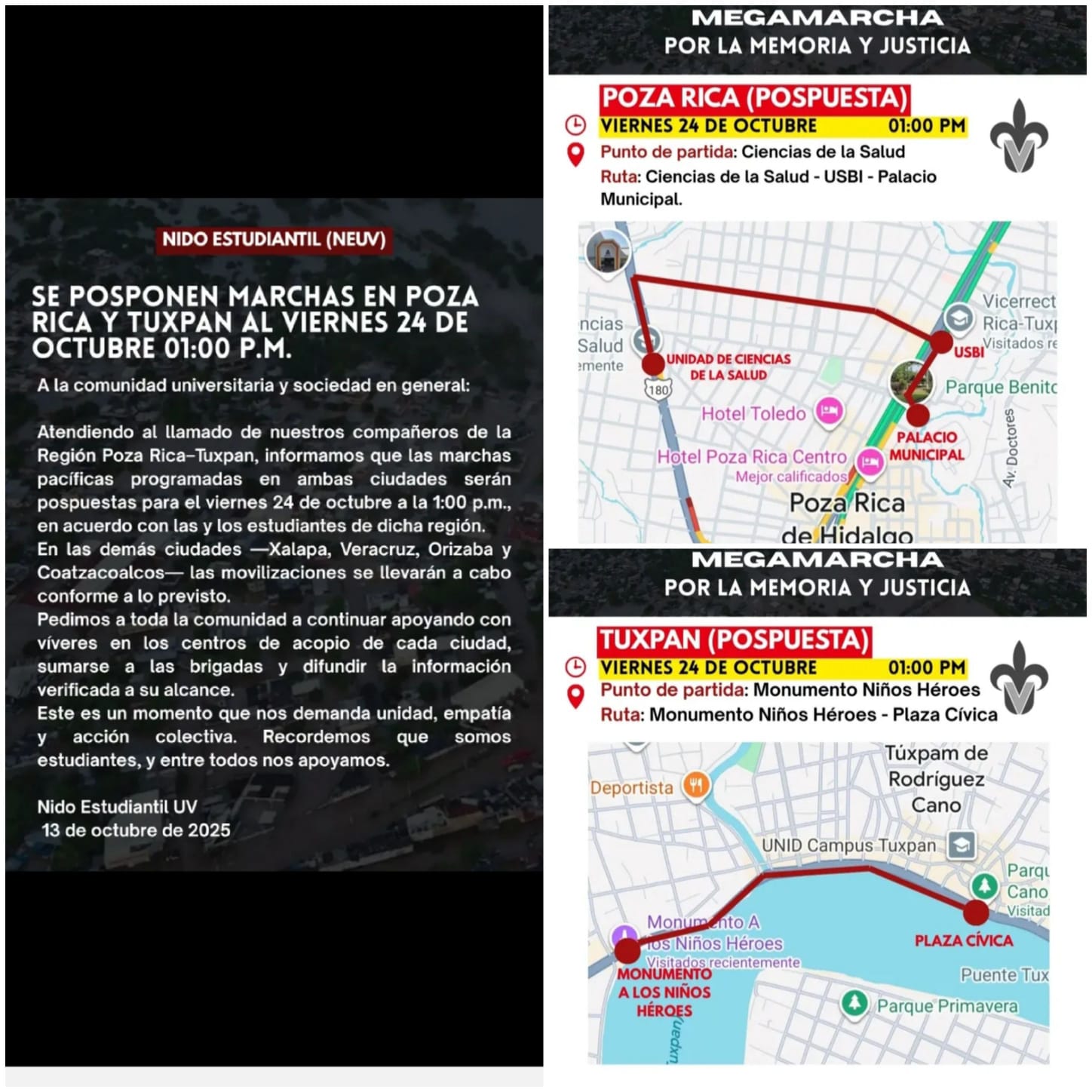 La comunidad estudiantil de la Universidad Veracruzana (UV) anunció la reprogramación de una megamarcha estatal para el viernes 24 de octubre, con el objetivo de exigir la búsqueda y localización de 192 estudiantes reportados como desaparecidos luego de las inundaciones que afectaron diversas zonas del estado de Veracruz.