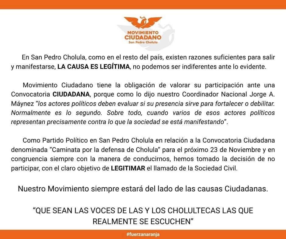 Mediante un comunicado, el partido naranja sostuvo que mantendrá su respaldo a las causas impulsadas por colectivos y habitantes de Cholula, pero sin intentar apropiarse de la iniciativa ni influir en su organización.