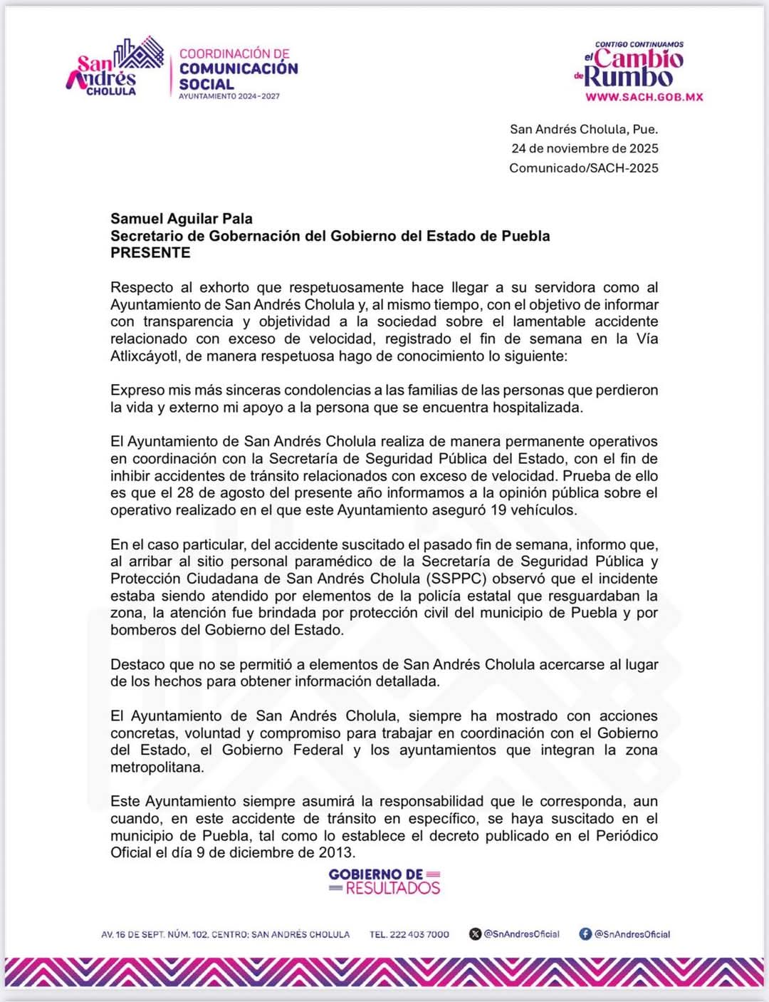 A través de un comunicado, la alcaldesa señaló que el percance no tuvo lugar dentro de los límites de San Andrés Cholula, sino presuntamente en territorio perteneciente a la capital poblana, gobernada por Pepe Chedraui. Ante ello, afirmó que los hechos no corresponden a su jurisdicción.