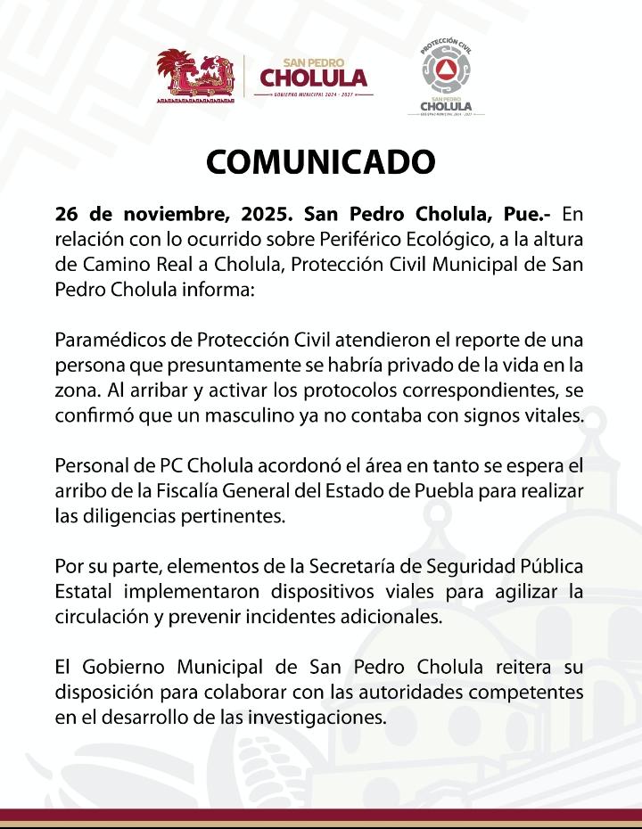 Paramédicos de Protección Civil de San Pedro Cholula acudieron al sitio y, tras realizar la revisión correspondiente, confirmaron que el hombre ya no presentaba signos vitales. De inmediato se aplicaron los protocolos de seguridad y se delimitó el área.