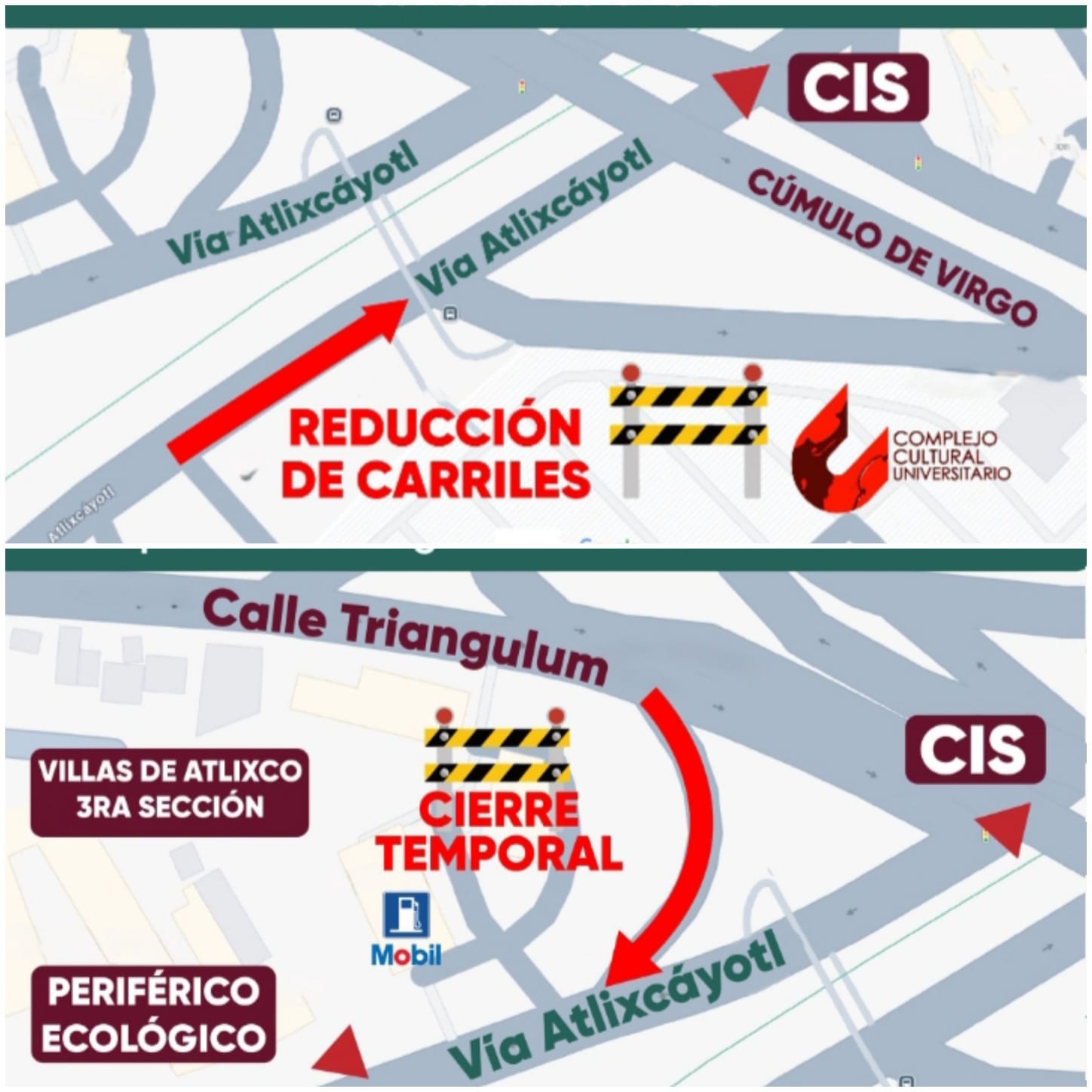 De acuerdo con la información difundida por autoridades estatales, a partir de las 19:00 horas se cerrará el acceso desde la calle Triangulum hacia la Atlixcáyotl, con dirección a Atlixco. Además, se aplicará una reducción de carriles a la altura del CCU en sentido al CIS, lo que podría generar cargas vehiculares en ese tramo.