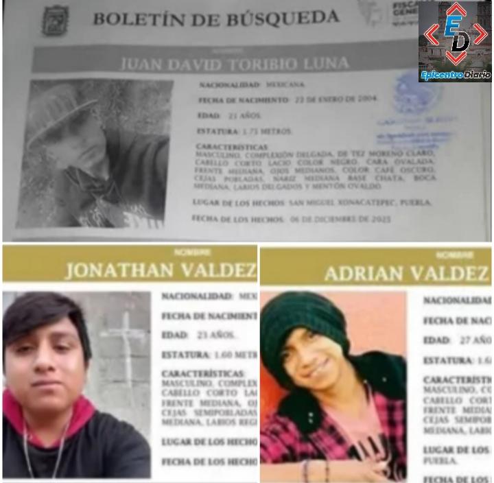Los desaparecidos son Juan David Toribio Luna, así como los hermanos Adrián y Jonathan Valdez Palma, originarios de la junta auxiliar de Santa María Xonacatepec. De acuerdo con sus familiares, los tres salieron de sus viviendas el viernes pasado y no regresaron, por lo que iniciaron su búsqueda en calles cercanas y a través de redes sociales.