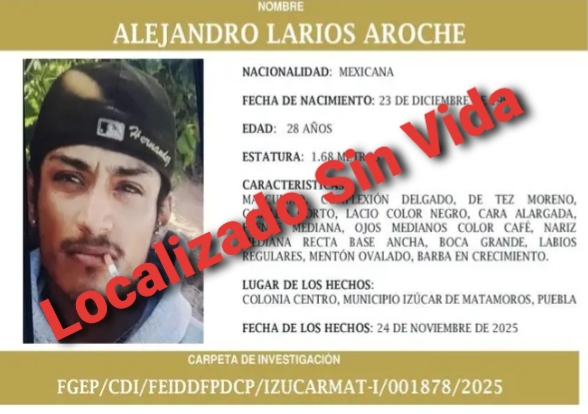 Posteriormente, la Fiscalía General del Estado (FGE) logró establecer su identidad tras realizar análisis de ADN, lo que permitió notificar a sus familiares. De acuerdo con los reportes oficiales, Alejandro había sido visto por última vez el 24 de noviembre de 2025 en el centro del municipio de Izúcar de Matamoros, fecha en la que también se formalizó su reporte de desaparición.