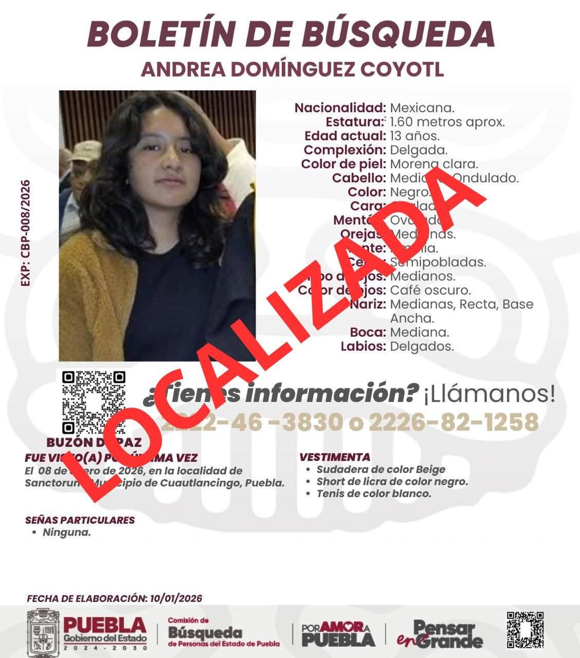 Tras varias horas de tensión y afectaciones viales en la autopista México–Puebla, autoridades estatales confirmaron que Andrea Domínguez Coyotl, adolescente de 13 años, ya fue localizada con vida y se encuentra en buen estado de salud en su domicilio.