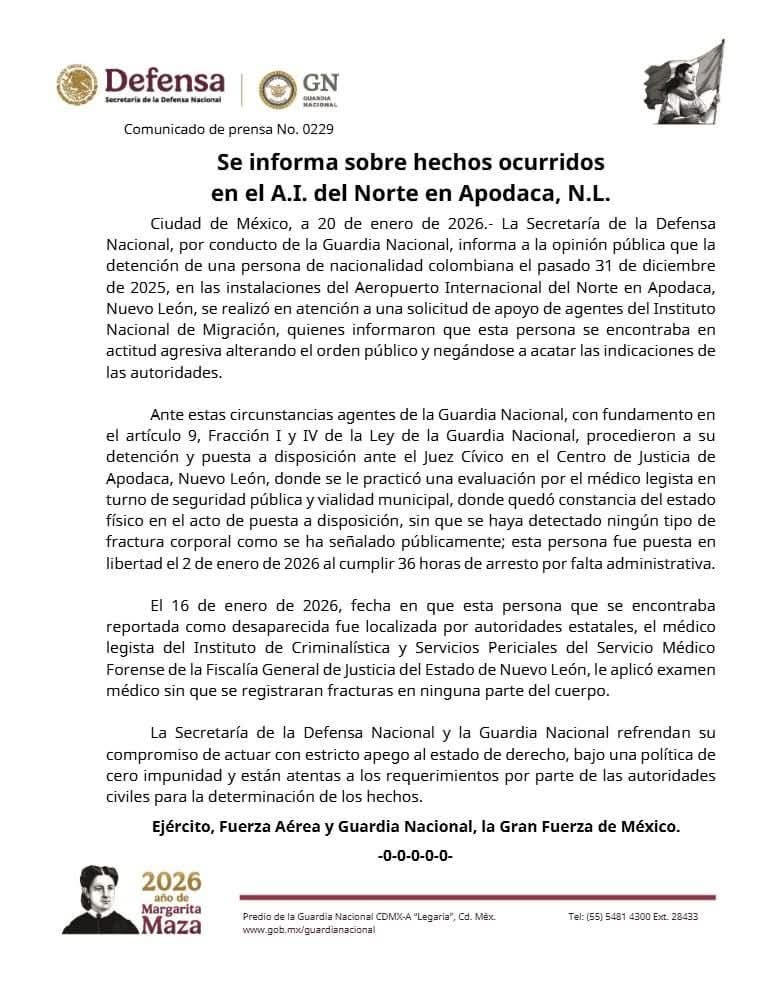 Luego de las declaraciones públicas del académico de la Universidad Iberoamericana, Leonardo Barrios, quien aseguró haber sido agredido físicamente por elementos de la Guardia Nacional durante una detención en el Aeropuerto Internacional de Nuevo León, la corporación federal rechazó categóricamente dicha versión y sostuvo que su aseguramiento ocurrió debido a conductas violentas y alteración del orden público.