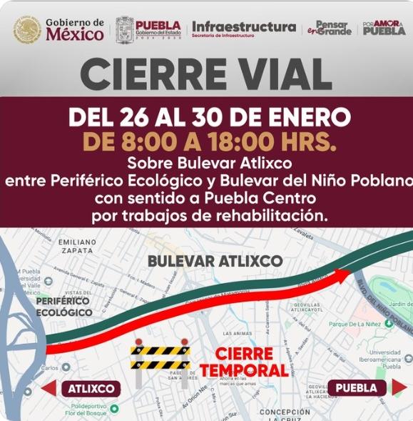 La Secretaría de Infraestructura del Estado informó que el bulevar Atlixco permanecerá cerrado a la circulación vehicular este jueves 29 y viernes 30 de enero, en el tramo que comprende del Periférico Ecológico al bulevar del Niño Poblano, en dirección al centro de Puebla.