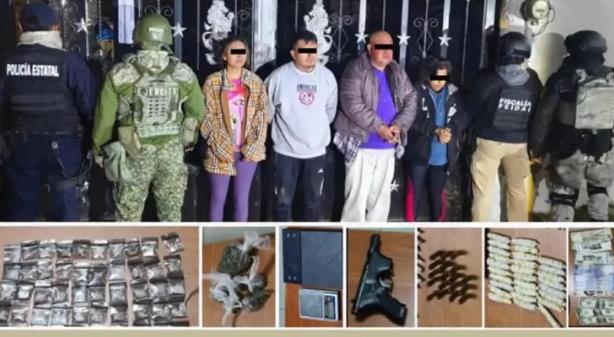 La intervención se llevó a cabo en un domicilio situado en el cruce de las calles Francisco Villa y 5 de Mayo, en la junta auxiliar de Santa Bárbara Almoloya. En el lugar también fueron detenidos José Luis N., María N. y Citlali N., quienes, de acuerdo con las autoridades, formarían parte de la misma estructura criminal.