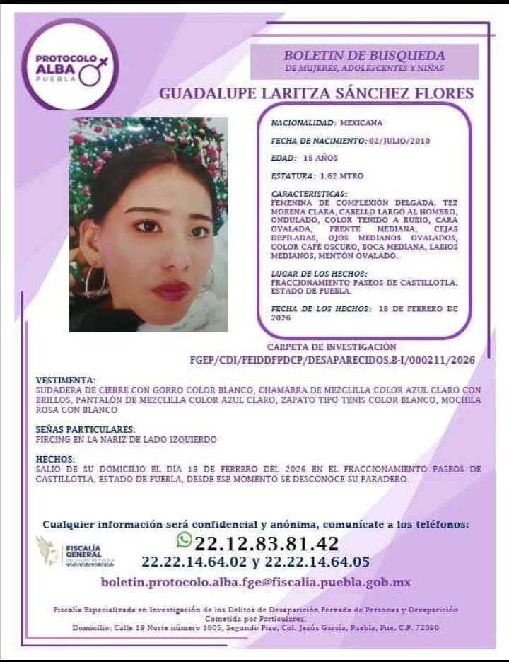 La Fiscalía General del Estado de Puebla emitió una Alerta Amber para la localización de Guadalupe Laritza Sánchez Flores, adolescente de 15 años cuyo paradero se desconoce desde el pasado 18 de febrero de 2026, cuando fue vista por última vez en el fraccionamiento Paseos de Castillotla, en la capital poblana.